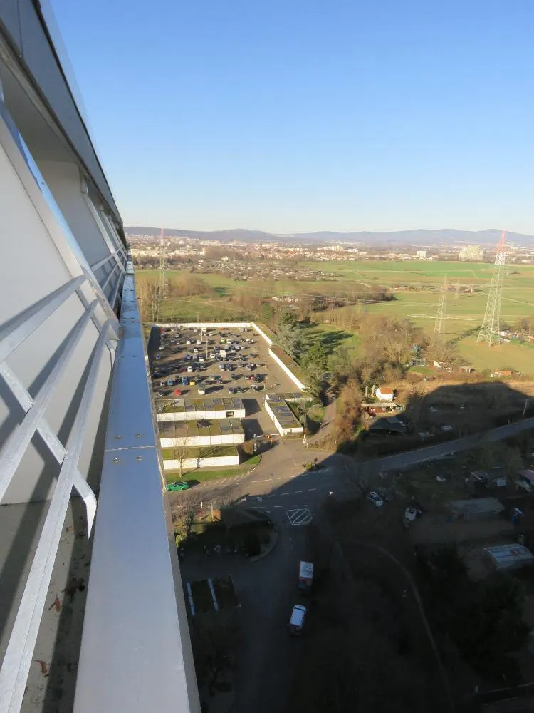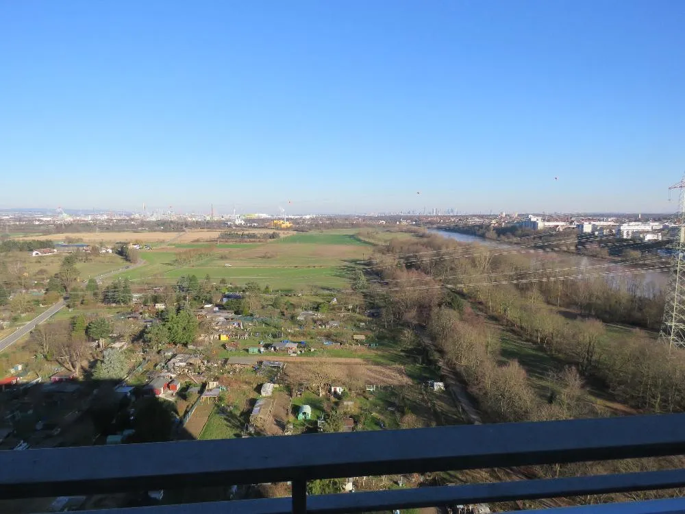 Die Wohnung liegt ganz oben im Gebäude im 17. OG und hat eine Fläche von ca. 38,42 m². Für eine Wohnung in dieser Größenordnung hat das Appartement einen sehr großen Balkon. Von hier aus geniest man eine wunderschöne, angenehme und unverbaute Aussicht ins Grüne bis zum Taunus und zur Frankfurter Skyline, was insbesondere in den Abendstunden beeindruckend aussieht. Das Gebäude befindet sich in Ortsrandlage, vor dem Haus befinden sich eine Kleingartenanlage und Grünflächen.